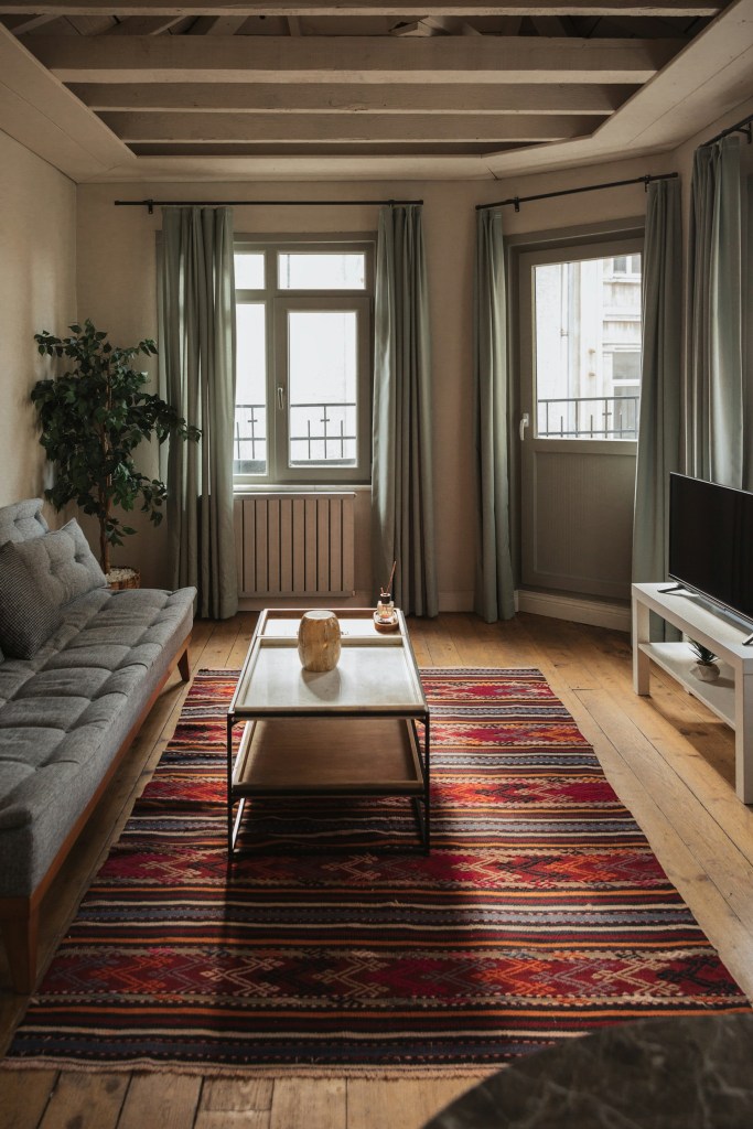 - Rugs second: A wool or jute rug anchors a room and adds acoustic softness. This single change transforms the feel underfoot and the sound of a space.